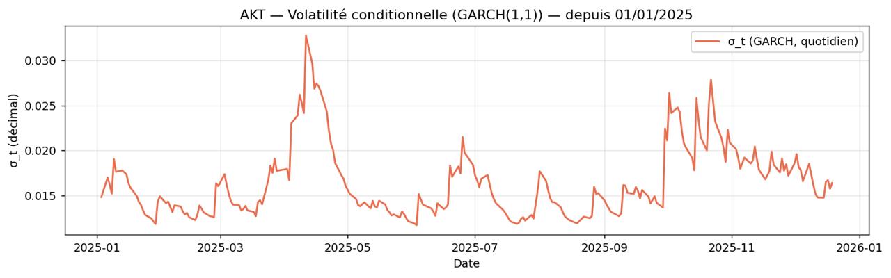 Les tests économétriques confirment cette lecture. Si les rendements eux-mêmes ne présentent pas d’autocorrélation directionnelle significative, la volatilité, en revanche, affiche une mémoire claire. Les tests de Ljung–Box appliqués aux carrés des rendements ainsi que le test ARCH-LM d’Engle mettent en évidence une variance conditionnelle dépendante des chocs passés.
