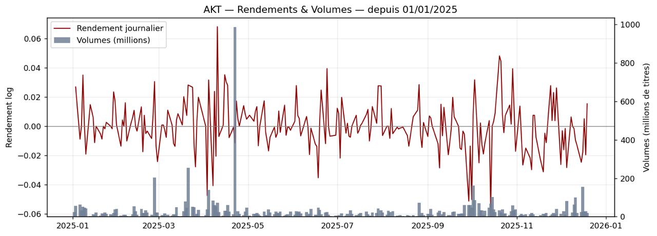 L’étude empirique menée des rendements journaliers depuis le début de l’année met en évidence une alternance entre périodes calmes et phases de forte agitation. Ce comportement, connu sous le nom de volatility clustering, est typique des valeurs très suivies, où les investisseurs réagissent en chaîne aux nouvelles, aux rumeurs et aux interprétations parfois hâtives.